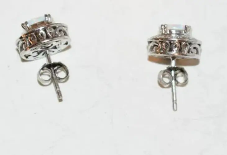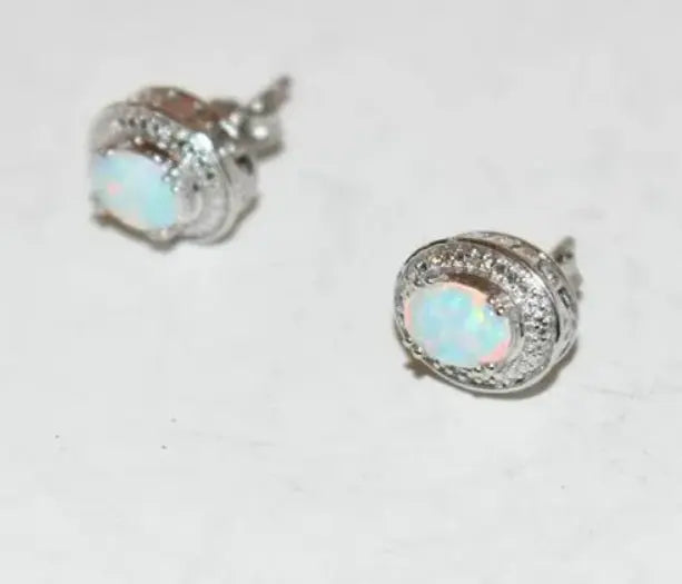7mm Sterling Silver Natural Opal & Diamond Oval Halo Stud Earrings