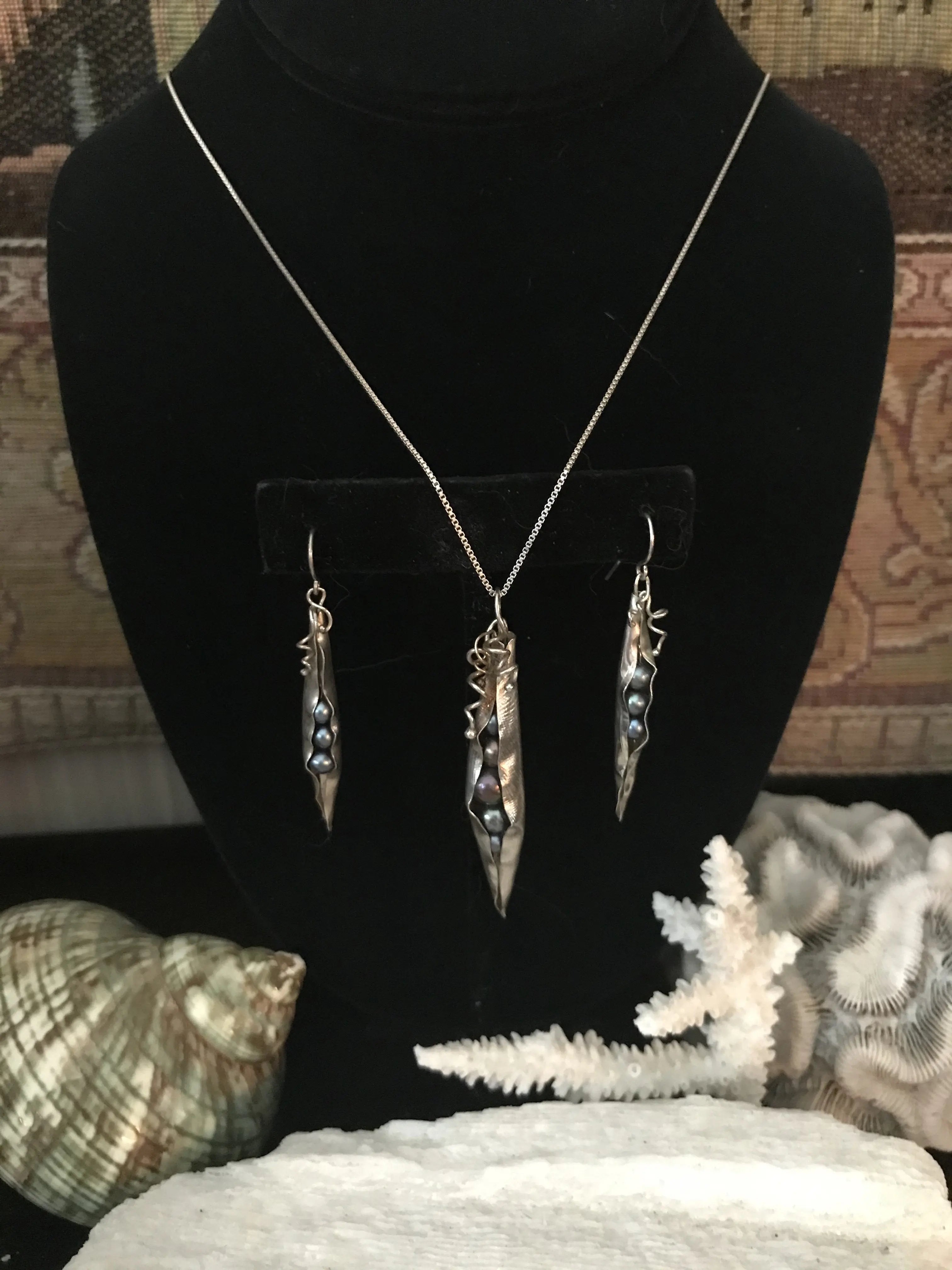 Dieses Schmuckset für Damen hat eine Länge von 59 mm, ist 9 mm breit und besteht aus 925er Sterlingsilber mit einer 18-Zoll-Sterlingkette. In der Erbsenkapsel sind 5–5 mm große schwarze Perlen eingeschlossen.