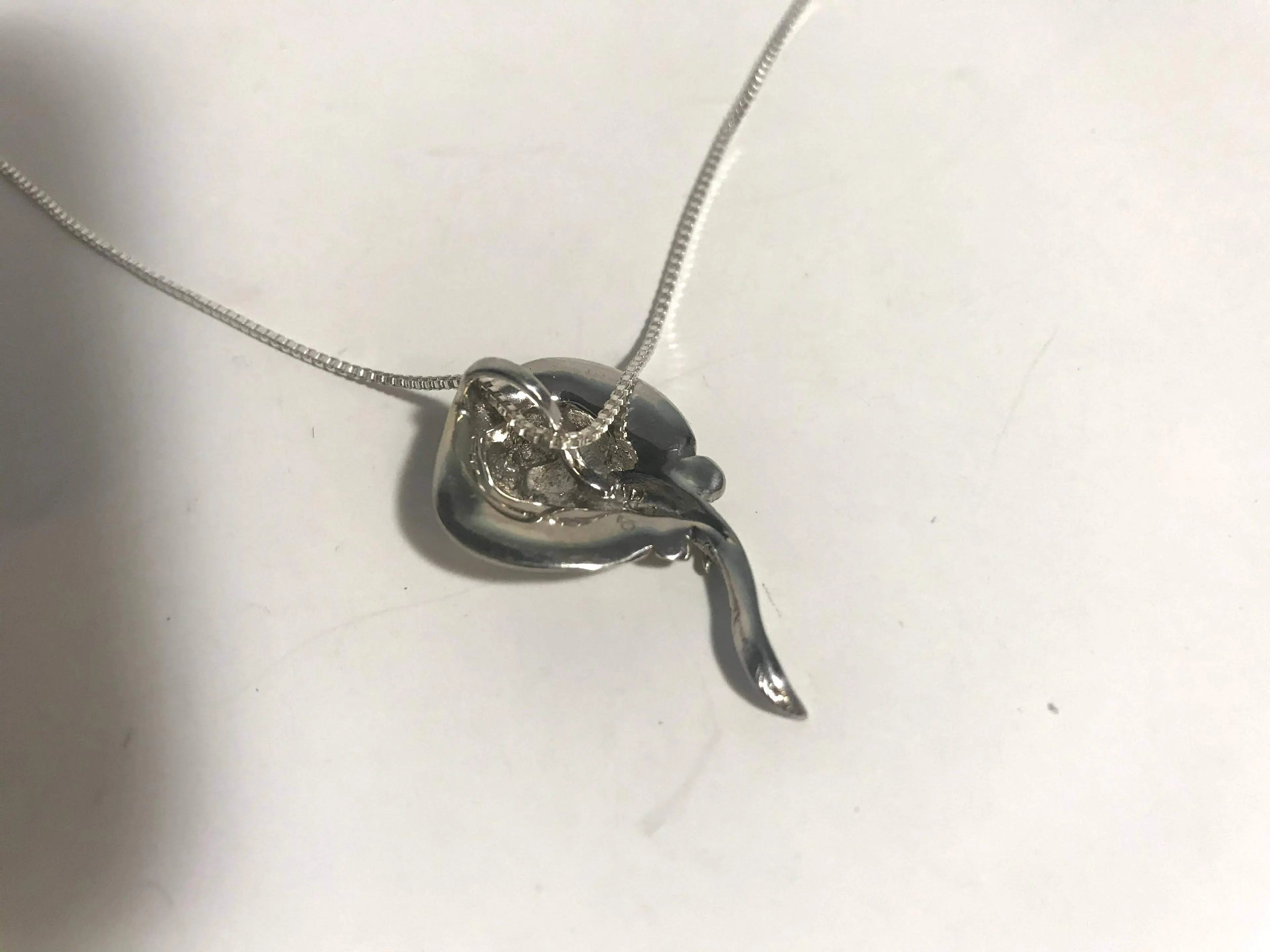 Dieser Anhänger hat eine Länge von 32 mm und ist 20 mm breit, die Sterlingsilberkette ist 9 Zoll lang und hat einen Karabinerverschluss.