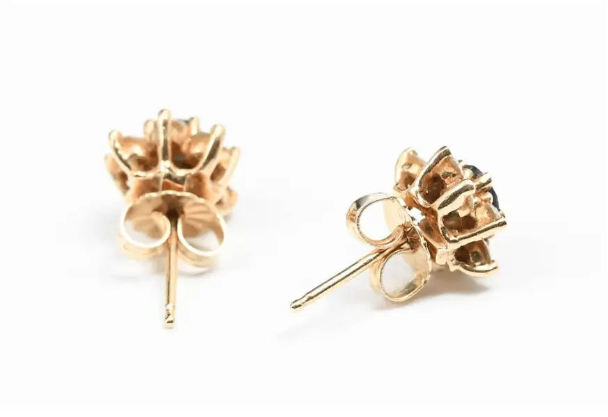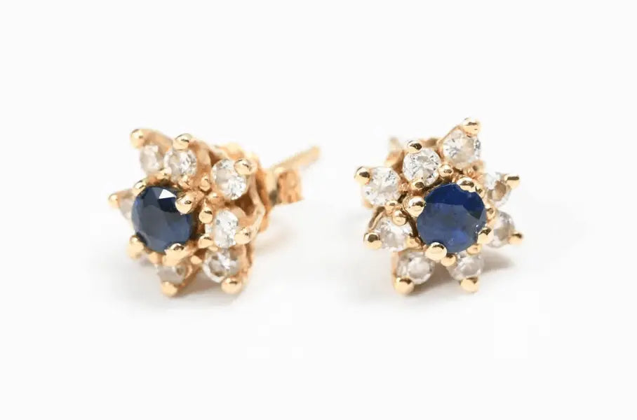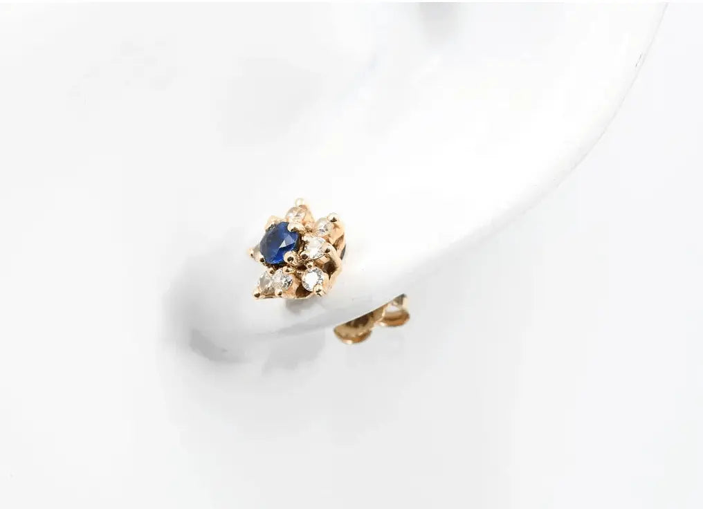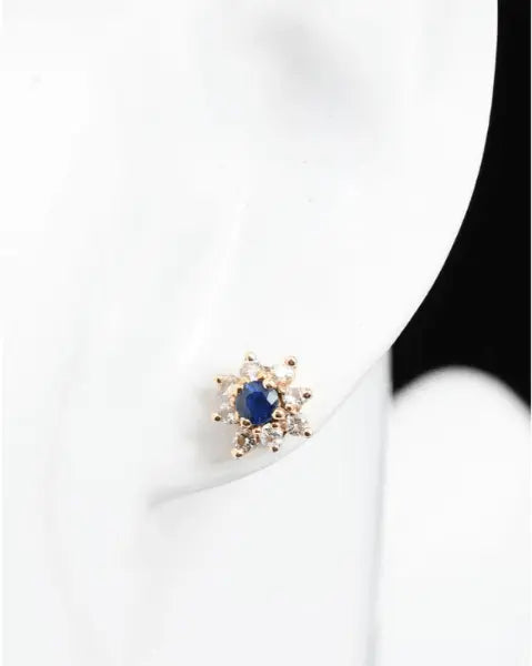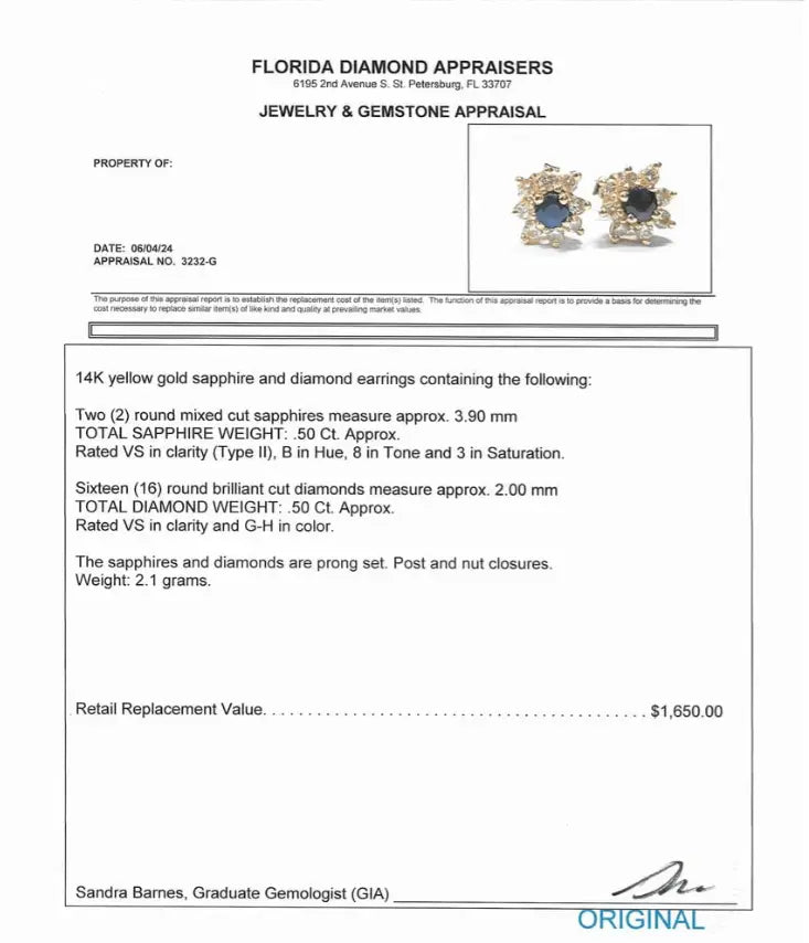Enhance your jewelry collection with these exquisite 14K Yellow gold, sapphire, and diamond earrings. Featuring 2 round mixed cut sapphires, totaling .50 Ct., and 16 round brilliant cut diamonds, totaling .50 Ct., these earrings radiate beauty and elegance. The sapphires and diamonds are prong set for maximum sparkle and are complemented by a post and cut closure. With a weight of 2.1 grams, these earrings are a valuable addition to any outfit. A professional appraisal by Florida Diamond Appraisers values these earrings at $1650.00, making them a must-have for any passionate jewelry enthusiast!