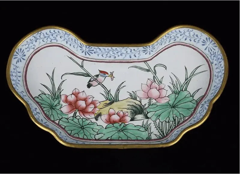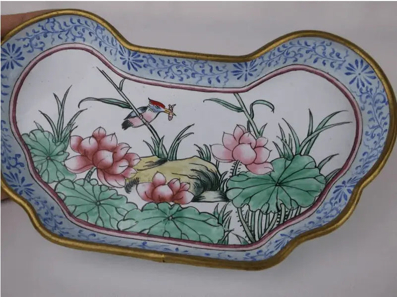 Antique Chinese Enameled Porcelain Lotus and Kingfisher Jewel Tray