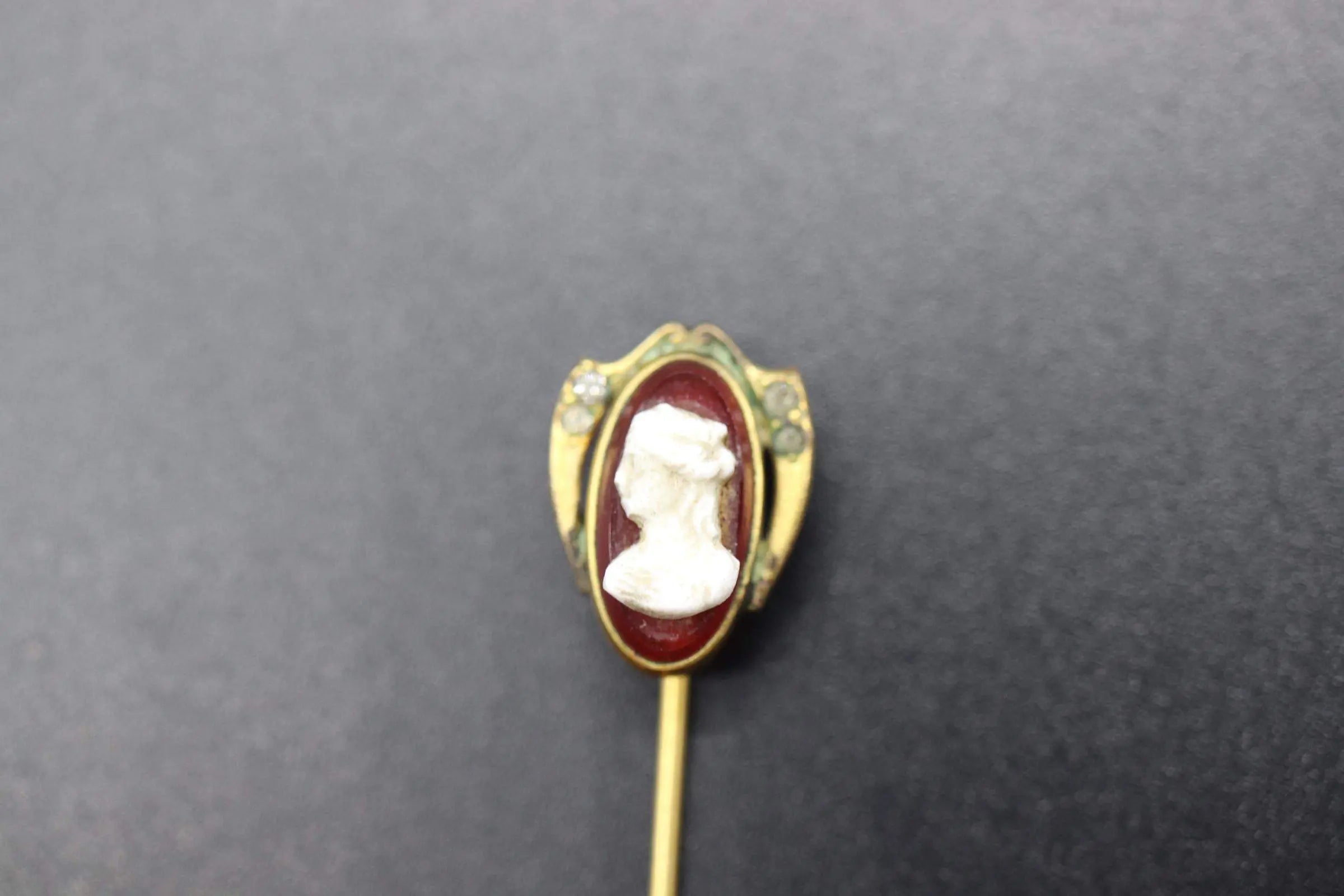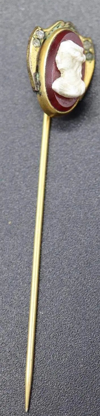 This is a very attractive Stick Pin. It is yellow gold in appearance. It is set in the center with a beautiful cameo. The stick pin is 2 &1/2 inches long in a classic Victorian design.