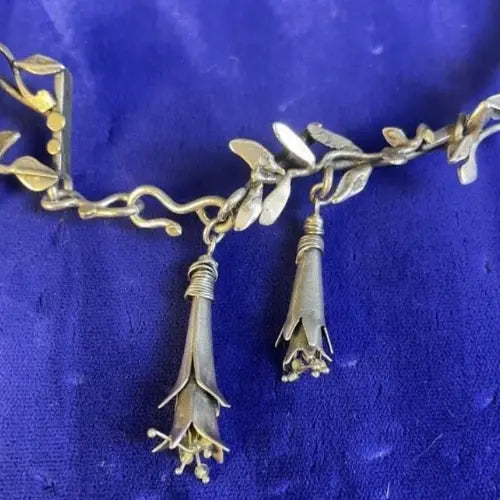 Two Silver Fuchsia flowers dangle from the leaf cluster.