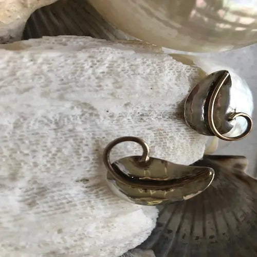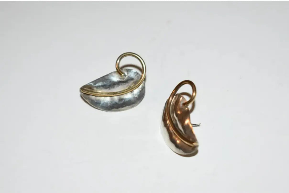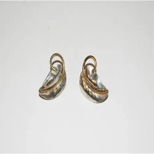 Highly collectible pair of authentic designer earrings by Louis Booth. The leaf motif is a combination of hammered sterling silver and brass.