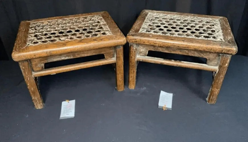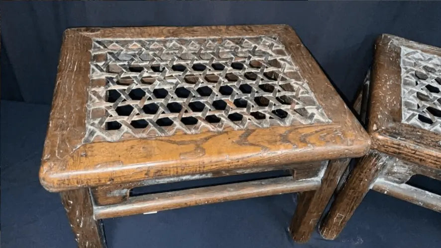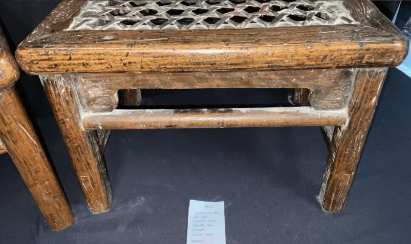 This exquisite pair of Chinese Elm Wood & Leather Stools, measuring 18" x 16.5" x 12" in height, boast intricate hand-woven patterns on the seat made by a skilled artisan using delicate hide strips. Crafted from Elmwood approximately a century and a half ago in Taiyuan China, this hand-hewn stool has only grown more captivating with time, with its darkened wood bearing marks of well-deserved use and adding to its textured, character-rich allure. May be from Ming Dynasty