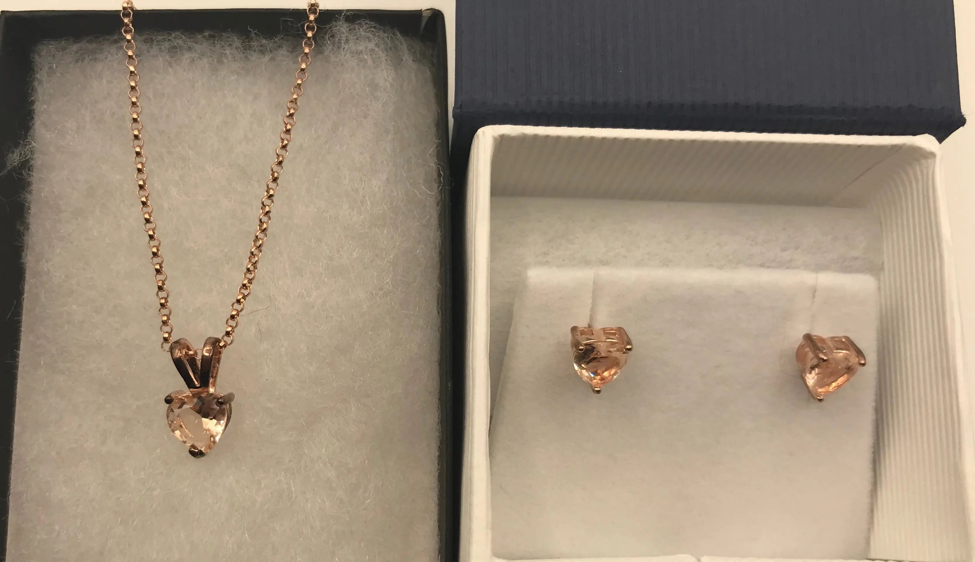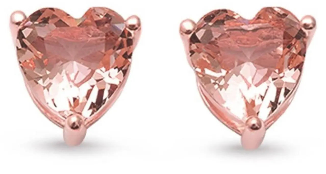 This morganite solitaire earrings and pendant set is crafted in rose gold over sterling silver. The set features heart-cut (7mm), (8mm) morganite gemstones. The pendant is hung on a 20-inch box chain and is secured with a spring ring clasp. The stud earrings are secured with push-back closures.