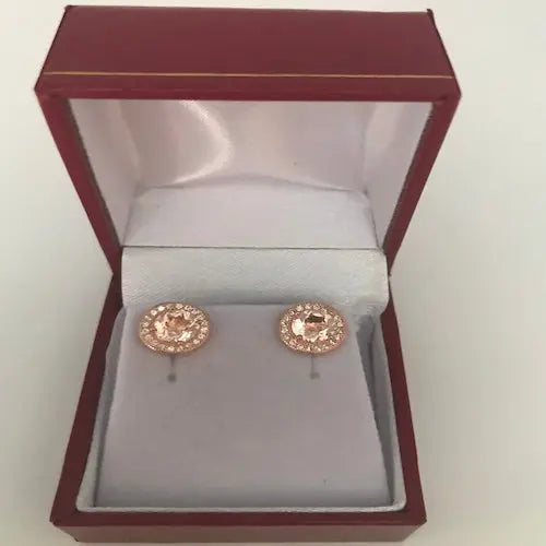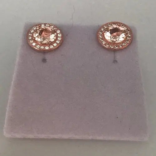 Add classic design and elegance to your look. These luxurious pair of morganite stud earrings are designed in 14K rose gold over sterling silver.  The peach color of the stone with the rose gold is a stunning display sure to be noticed.