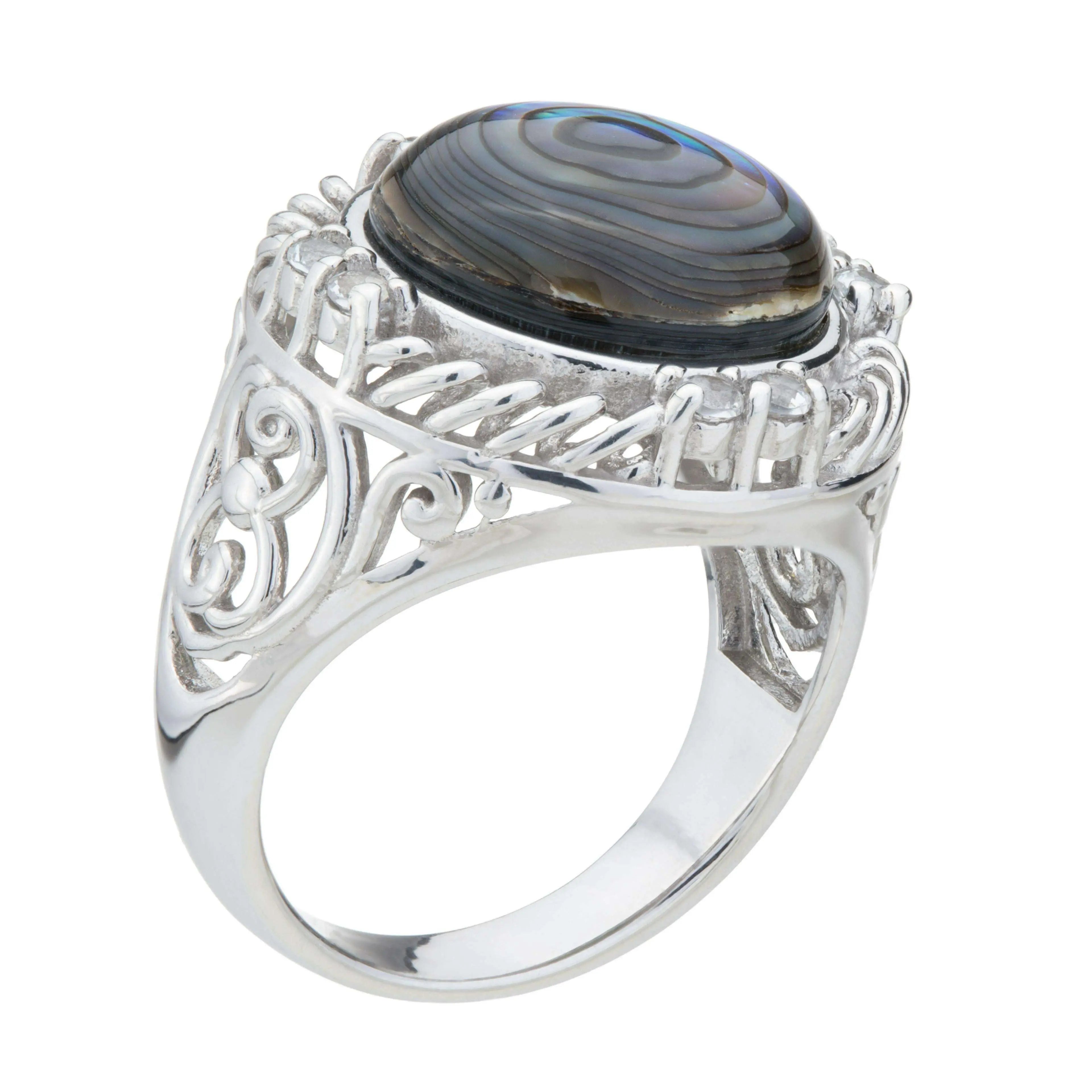 One round alluring genuine Abalone Shell cabochon is artfully crowned with mesmerizing spirals of sterling silver..