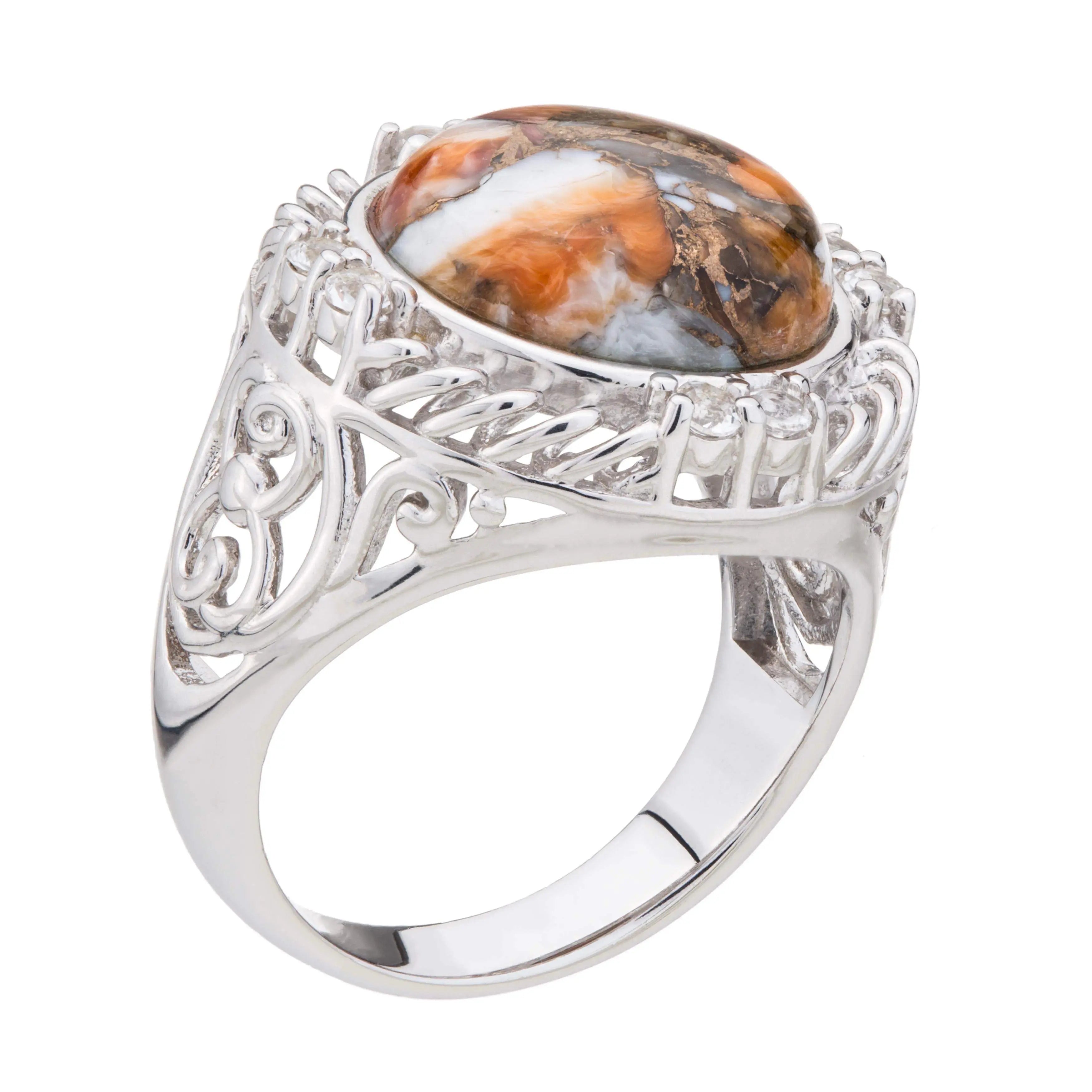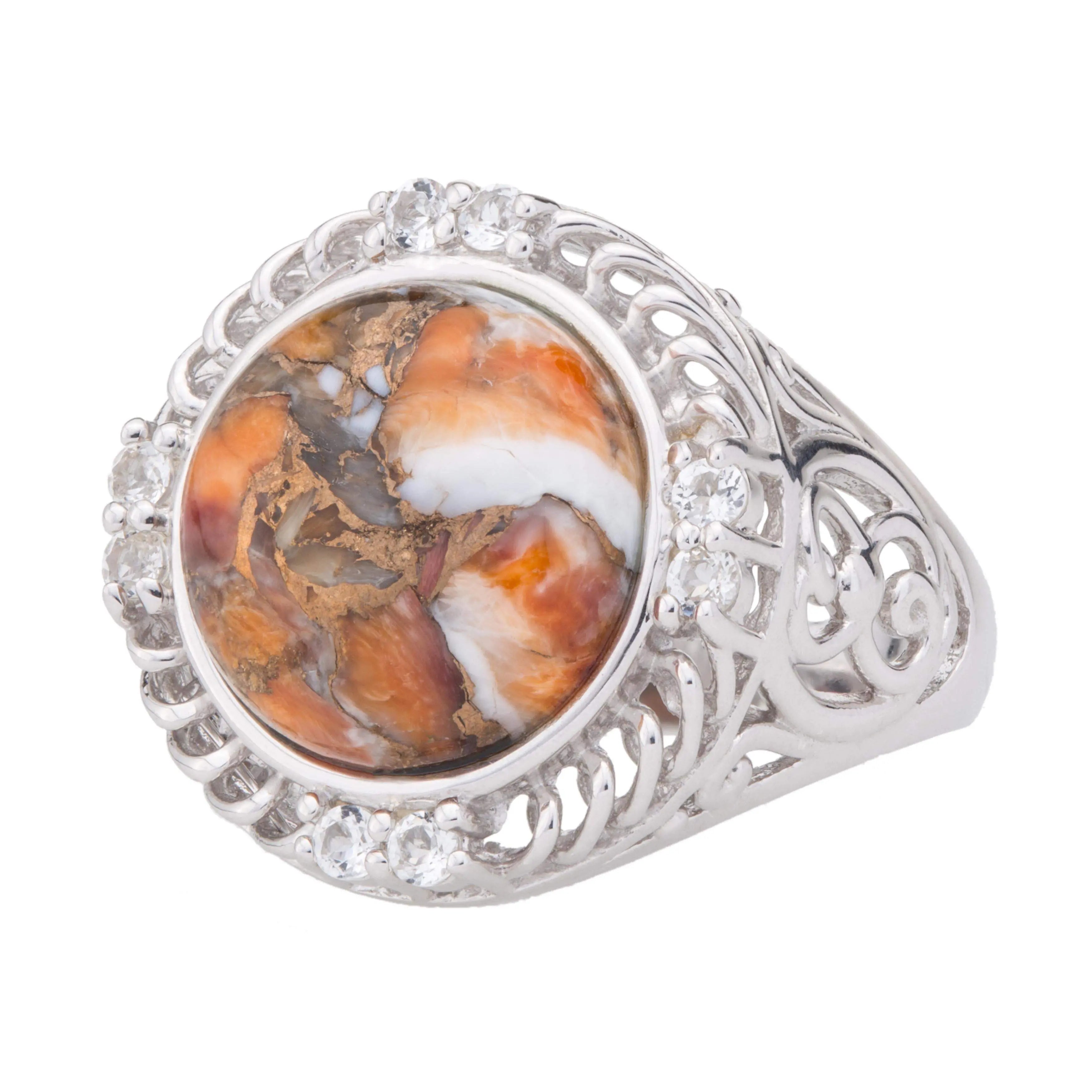 One round vibrant Spiny Oyster with shimmering metallic bronze matrix cabochon is artfully crowned with mesmerizing spirals of sterling silver.. Pairs of shimmering white topaz mark the cardinal points and open scrollwork side galleries keep the fit light and lively. Complete with a High polished rhodium plate to prevent tarnishing.