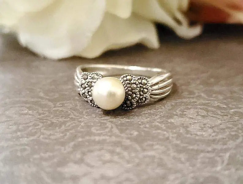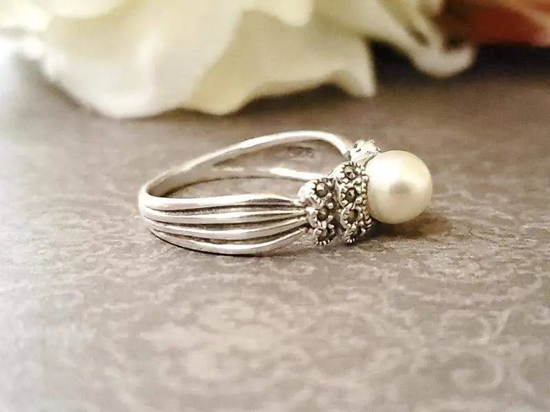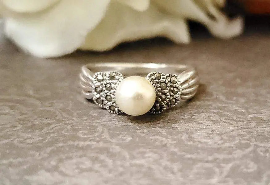 Sterling Silver White Pearl and Marcasite Ring Size 7