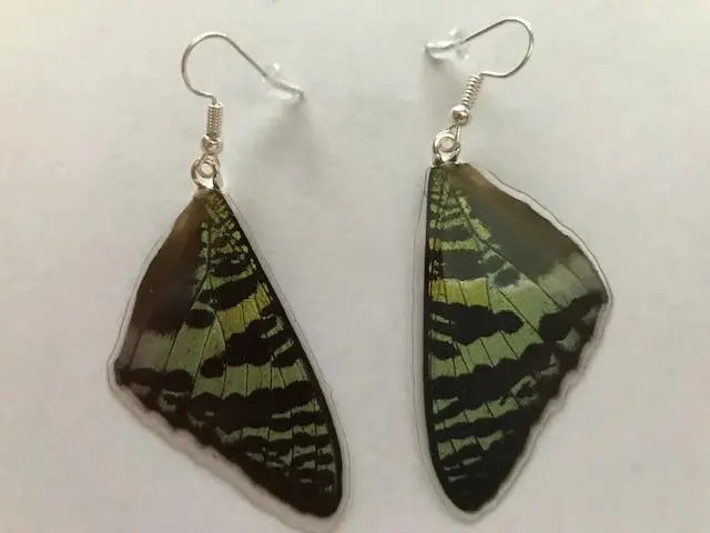 The Madagascan sunset moth, is a day-flying moth of the family Uraniidae. It is considered one of the most impressive and appealing-looking lepidopterans.  Earrings measure approximately 1.25"x1.75" each (measurement does not include the earring hooks).