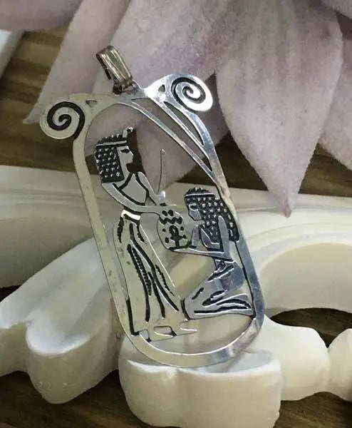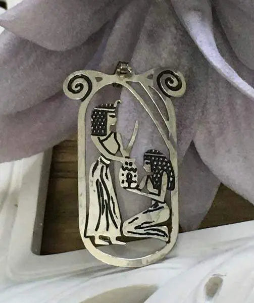 Sterling Silver Pendant is diamond cut with the all-important ancient symbol of life, Ankh being delivered by a female servant.